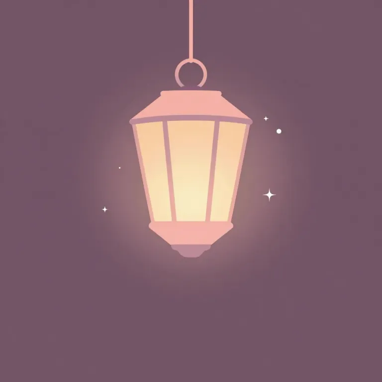 A warm, glowing lantern hangs against a dusky purple backdrop, casting a soft, ethereal light. The minimalistic composition and shallow depth of field create a serene, dreamy atmosphere.