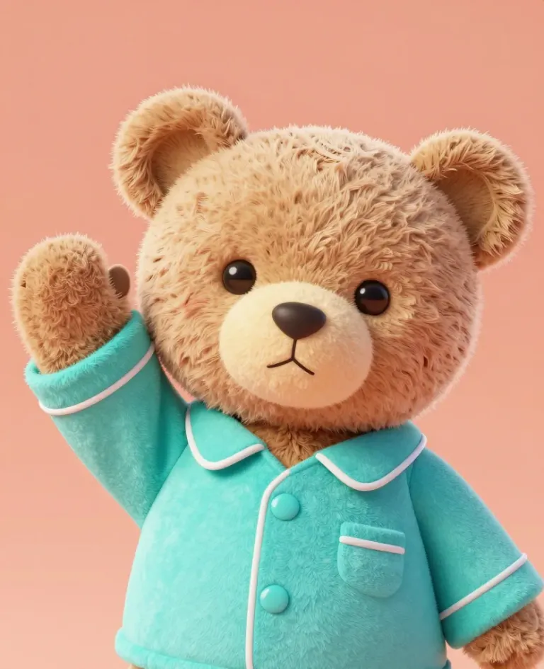 A cozy teddy bear in teal pajamas waves with one paw, set against a soft, diffused light that highlights its face and upper body. The simple, solid pink background provides a warm and uncluttered backdrop, ideal for children's or home decor themes.