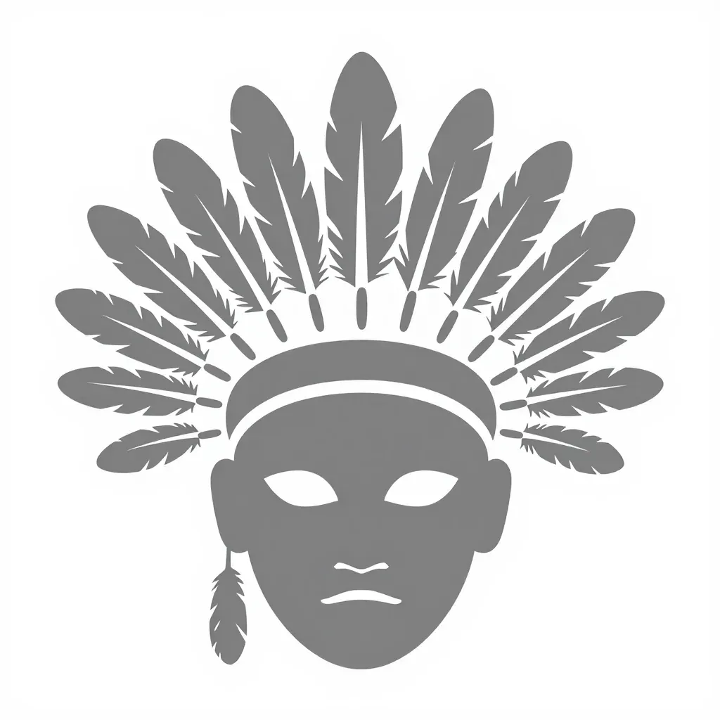 A stylized silhouette of a Native American face adorned with a feathered headdress, rendered in flat, matte gray tones. The even, front-lit illumination and centered, symmetrical composition on a plain light gray background create a clean, isolated icon suitable for graphic design.