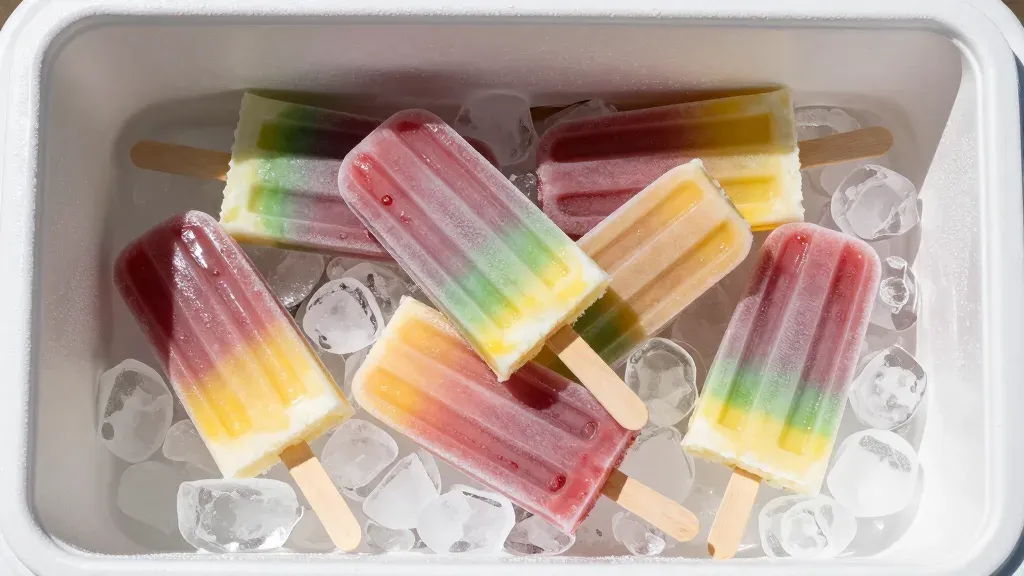 Homemade popsicles with creamy white, deep red, and bright yellow layers, arranged in a scattered pattern in a styrofoam cooler filled with ice cubes, creating a cool and refreshing visual. Soft, diffused light reflects off the glossy surfaces, enhancing the shimmering effect of the popsicles and ice.