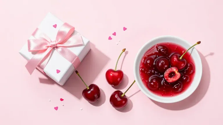 A white gift box tied with a soft blush pink satin ribbon sits beside a bowl of glossy cherry compote, with whole cherries scattered nearby on a pale pink surface. Soft overhead lighting creates subtle highlights on the syrupy cherries and ribbon, while a shallow depth of field emphasizes the central elements against a clean, uniform background.