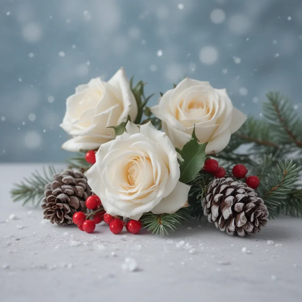 A bouquet of velvety white roses, glossy red berries, and frosty pinecones is centered against a snowy, blurred background with a bokeh effect, creating a soft, diffused light that highlights the textures and colors of the subjects. The shallow depth of field draws attention to the bouquet, making it ideal for use in holiday or winter-themed designs.