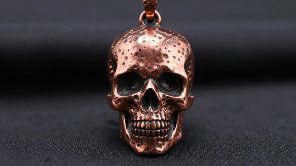 A close-up of a glossy copper skull pendant with intricate engravings, softly lit to highlight its texture and depth, set against a blurred black background to emphasize the pendant's details.