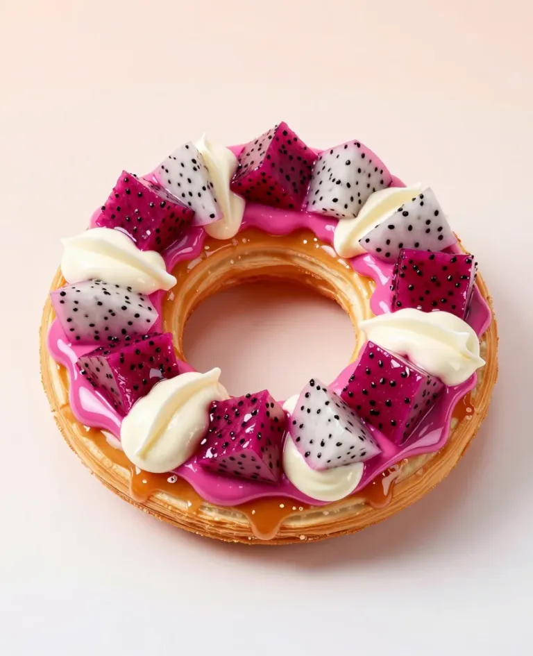A visually appealing pastry adorned with glossy dragonfruit slices and creamy frosting, highlighted by warm, soft lighting that enhances its glossy glaze and creamy texture. The clean white background ensures the focus remains on the pastry's vibrant colors and symmetrical arrangement.