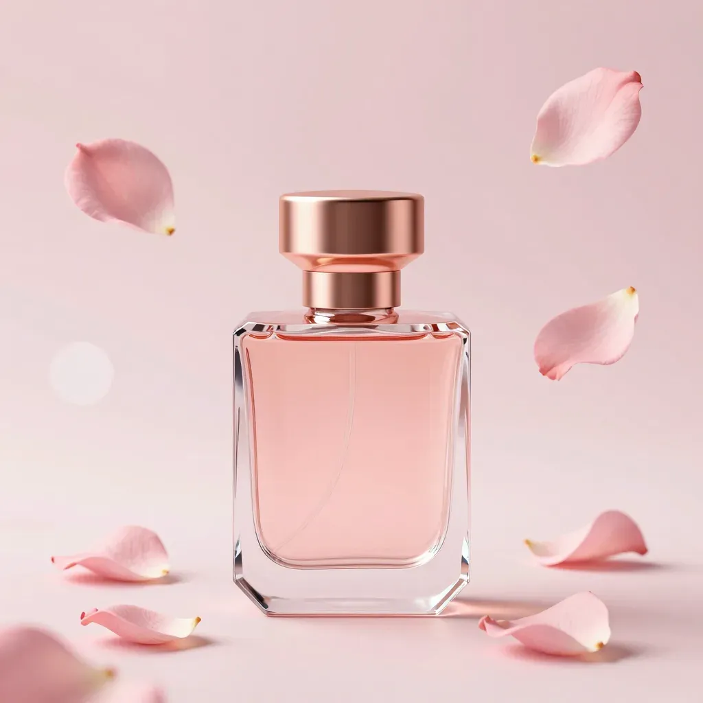 A crystal perfume bottle with a rose gold cap is centered against a soft, diffused light, creating gentle highlights on the bottle and petals. The blurred pink gradient background enhances the focus on the bottle and scattered petals, creating a sense of movement and depth.
