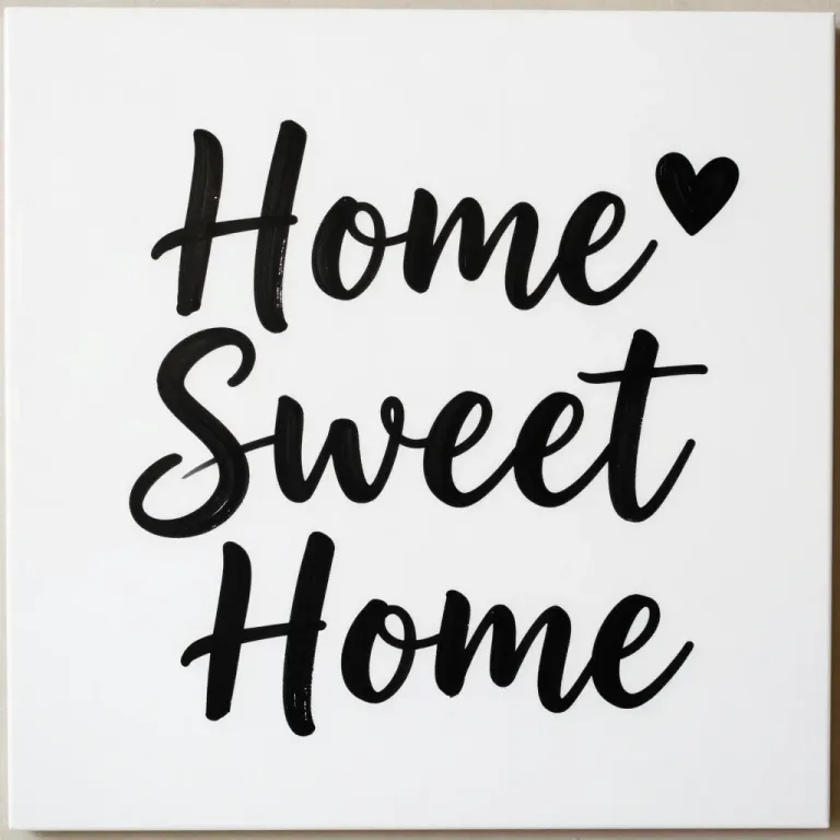 A glossy, white 'Home Sweet Home' sign with black cursive text and a heart symbol, illuminated by soft, ambient light that creates a warm glow. The minimal white background ensures clear focus on the text, making it ideal for interior design and home decor.