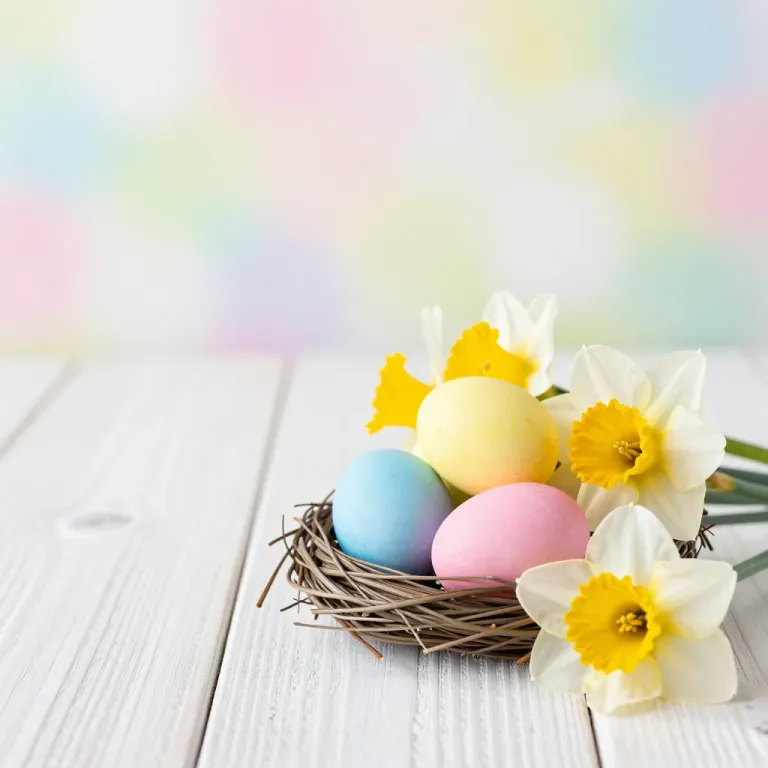 A nest with glossy pastel eggs and delicate daffodils bathed in soft, diffused light, creating a balanced and harmonious composition against a blurred pastel background. The gentle highlights and natural textures enhance the ethereal atmosphere.
