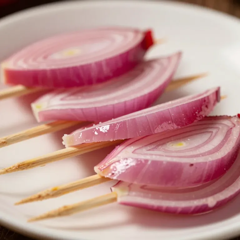 Translucent, glossy pickled onion slices on wooden skewers, softly lit to highlight texture and create subtle shadows. Shallow depth of field blurs the background, emphasizing the subject on a clean white plate.