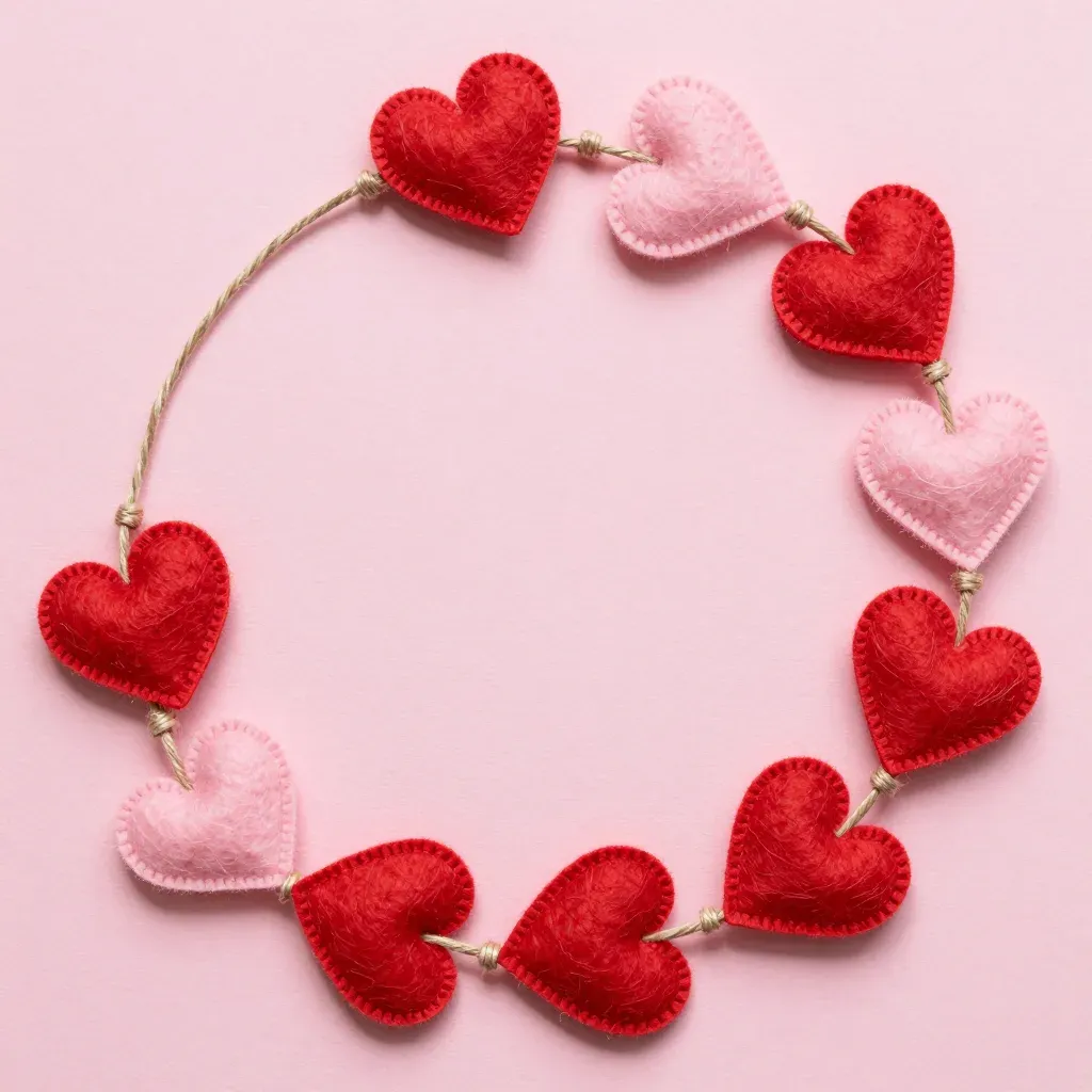A soft, glossy felt heart garland forms a circular loop, highlighting its vibrant red and pink hues against a blurred, solid pink background. The diffused lighting accentuates the glossy edges, creating a warm and inviting visual.
