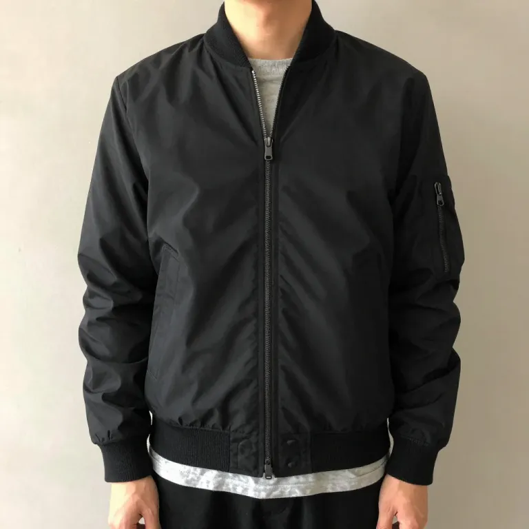 A model wears a sleek black bomber jacket with smooth, glossy fabric and slightly puffed sleeves, illuminated by soft, diffused light that creates subtle highlights and shadows. The plain, neutral background ensures a clean, focused presentation.