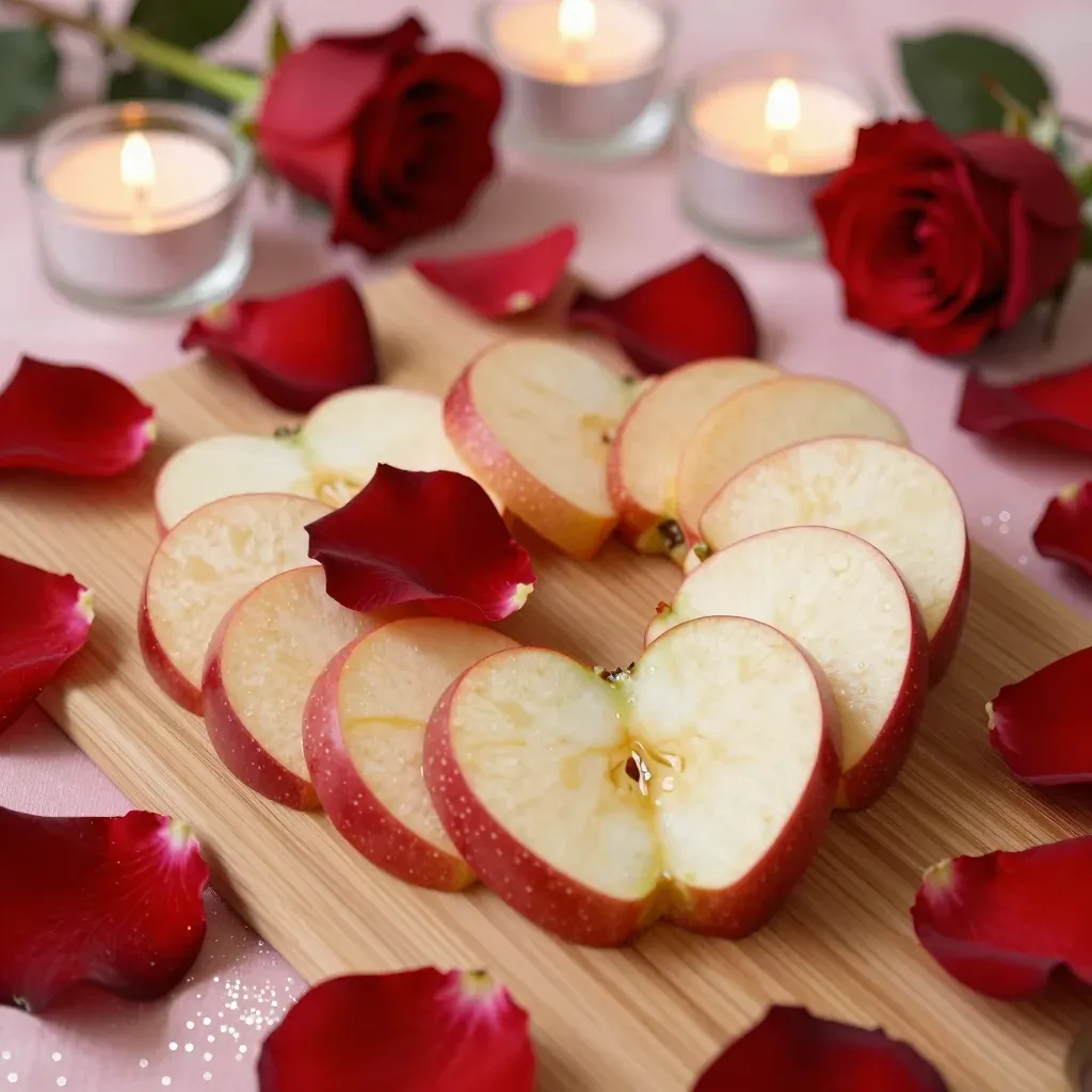 Sliced apples arranged in a heart shape on a wooden board, surrounded by crimson rose petals, with a glossy sheen on the apple flesh and soft, velvety texture on the petals. Warm candlelight creates gentle highlights and soft shadows, while a shallow depth of field blurs the background, emphasizing the central composition.
