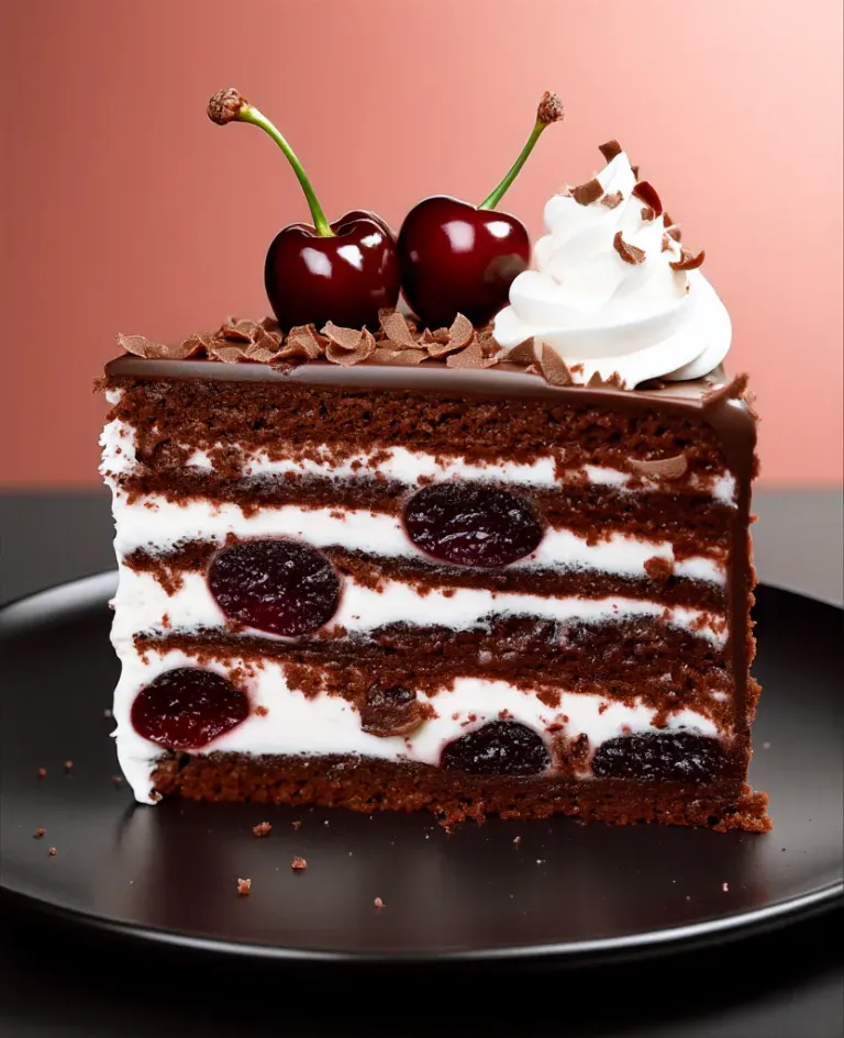 A close-up of a moist Black Forest cake slice, layered with creamy white filling and glossy cherries, topped with whipped cream and chocolate shavings, illuminated by soft, warm lighting that highlights the glossy sheen and creamy texture. The blurred, warm-toned background ensures the focus remains on the cake's intricate layers and textures.