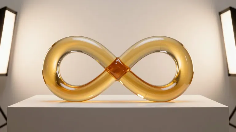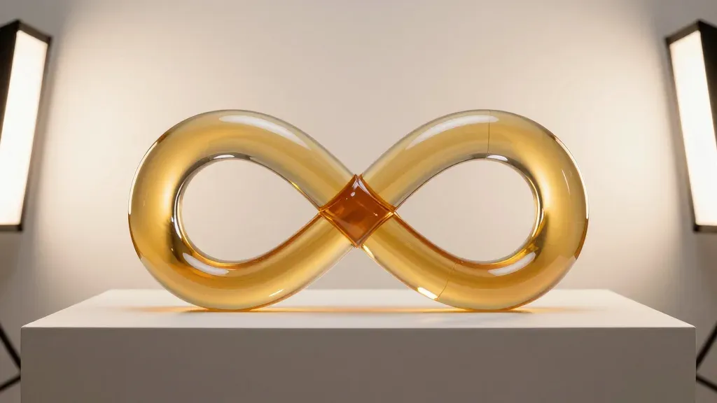 A golden-glass infinity symbol glows with soft, diffused light, creating a serene and harmonious scene. The minimalist background and balanced composition highlight the sculpture's elegant design and reflective surface.