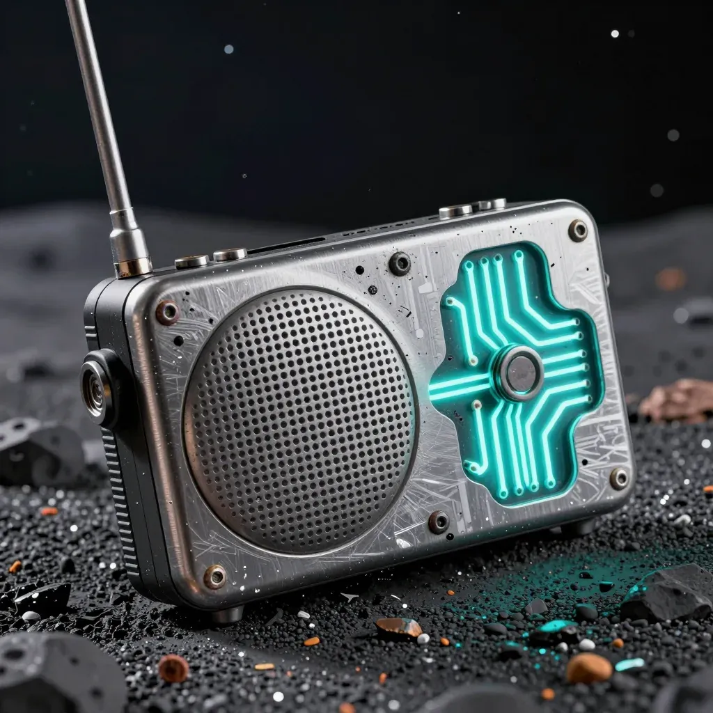 A cybernetic radio transceiver with a glowing green circuit board sits on a dark, rocky, lunar-like surface, illuminated by soft ambient light. The composition emphasizes the subject with scattered debris and a shallow depth of field.