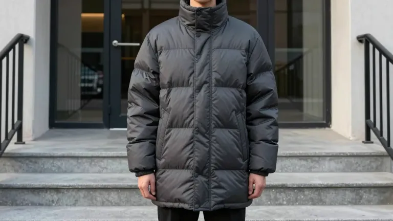 A person stands on stone steps wearing a dark gray puffer coat, with soft, diffused lighting highlighting the coat's glossy texture and creating subtle reflections. The modern building with glass doors and metal railings in the background is slightly blurred, emphasizing the subject.