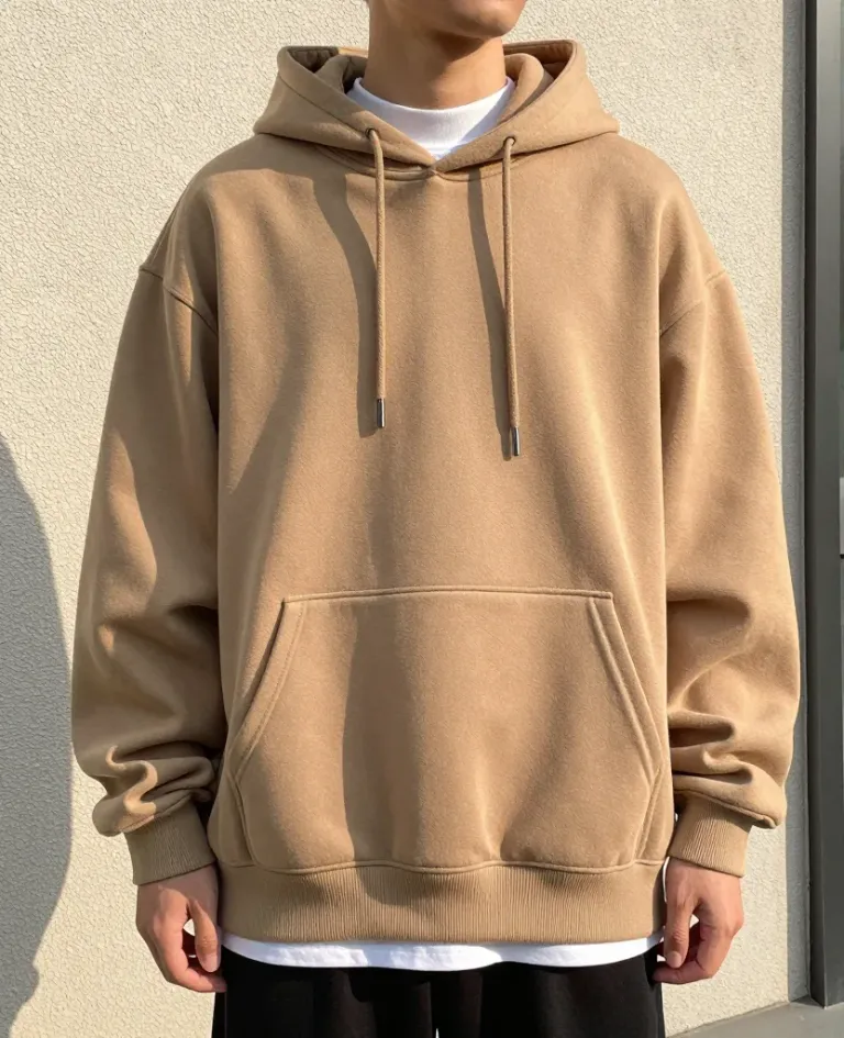 A person wearing a tan hoodie and white t-shirt stands outdoors under warm, golden sunlight, creating soft shadows. The neutral, textured wall in the background slightly blurs, emphasizing the subject.