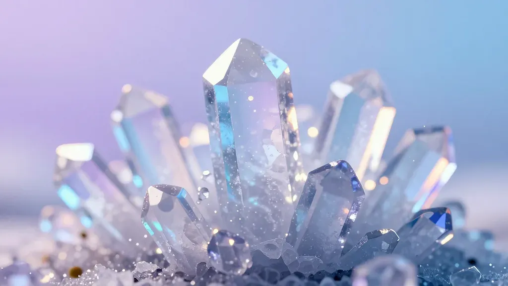 A close-up of iridescent ice crystals, their glossy surfaces catching soft, diffused light, creating a shimmering effect. The blurred gradient background enhances the focus on the intricate details of the crystals, providing a clean and shallow depth of field.