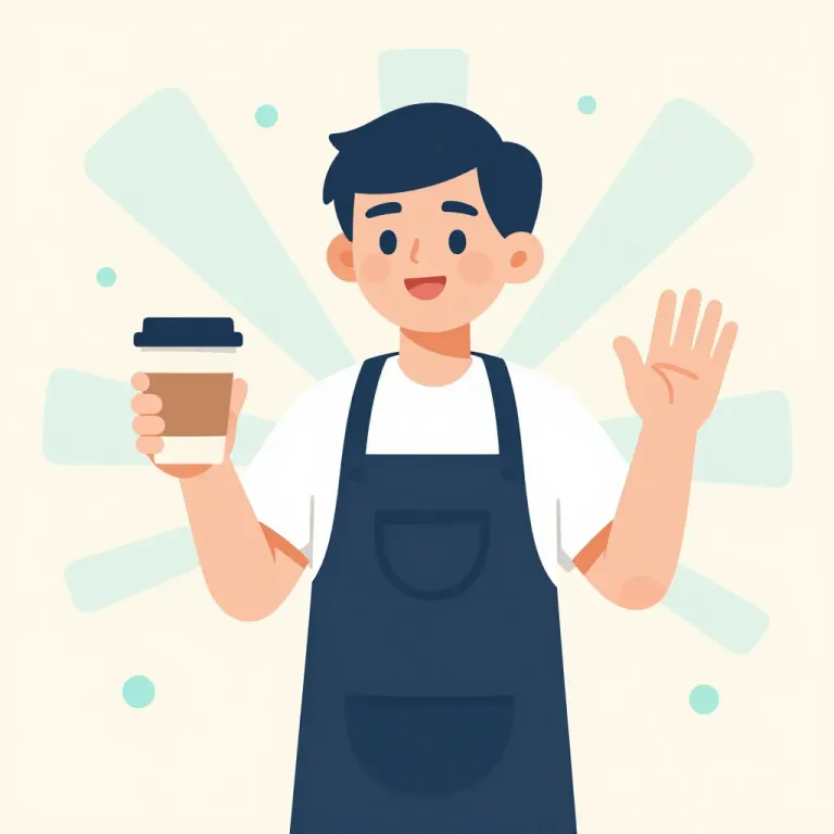 A barista extends a wave while holding a glossy coffee cup, set against a soft, diffused light that highlights the subject. The light beige background with subtle blue accents creates a clean and approachable feel, ideal for branding or promotional materials.