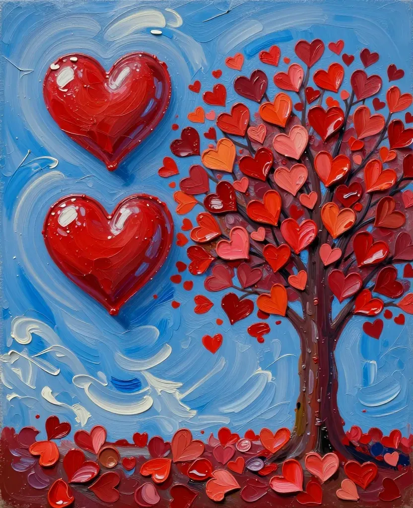 A heart-shaped tree with glossy red hearts cascading down, set against a blue sky with white swirls, creating a serene and romantic atmosphere. The soft, diffused lighting highlights the glossy surfaces of the hearts, emphasizing their vibrant red hues and the texture of the tree's rough bark.