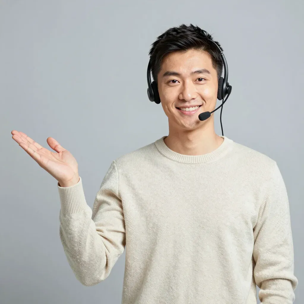A person in a beige sweater and black headset gestures with an open hand, conveying openness and engagement. Soft, diffused lighting highlights the subject against a neutral gray background, creating a clean and focused composition.