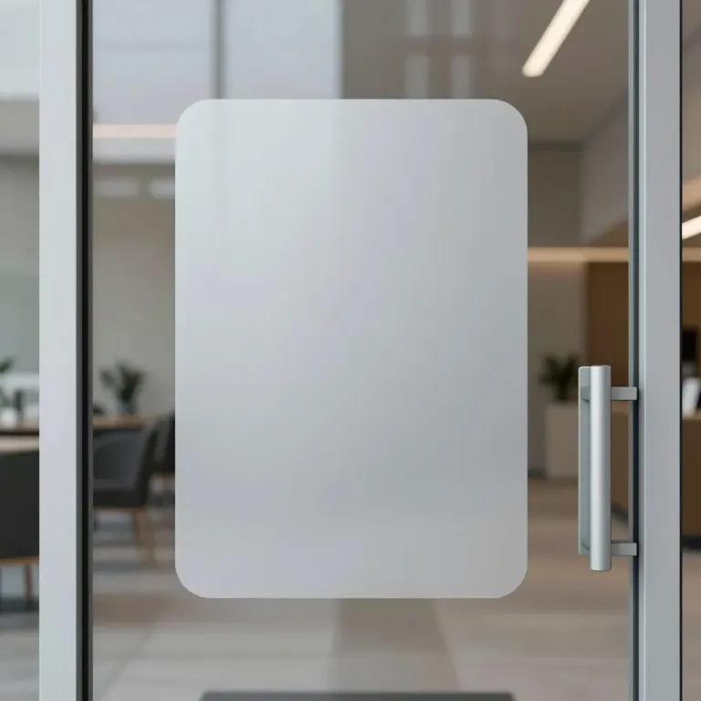 A smooth, opaque frosted glass door decal with subtle reflections, set against the backdrop of a modern office with large windows and sleek furniture. The diffused, ambient lighting highlights the decal's texture and creates a clean, professional atmosphere.