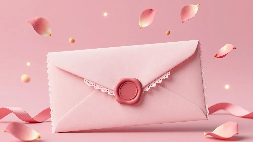 A soft pink envelope with a delicate lace edge and glossy wax seal, set against a diffused, warm, and soft light that highlights the textures. The composition is centered with scattered petals, creating a sense of depth and movement, against a blurred pink background that enhances focus on the envelope and petals.