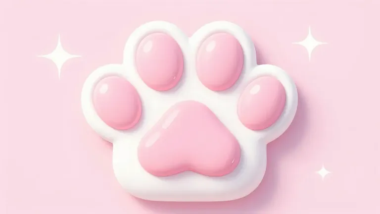 A glossy paw print in soft pink and white, set against a pastel pink background with delicate star sparkles. The image features soft, diffused lighting from above, creating gentle highlights and reflections, emphasizing the three-dimensional texture and smooth surface of the paw print.