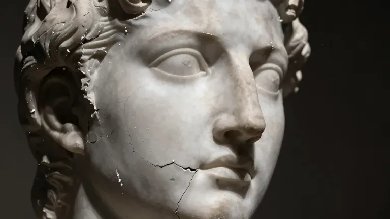 A close-up of a marble statue's head, showcasing intricate details and chipped areas under diffused, soft lighting. The dark, blurred background emphasizes the texture and cracks of the statue, creating a dramatic and detailed visual.
