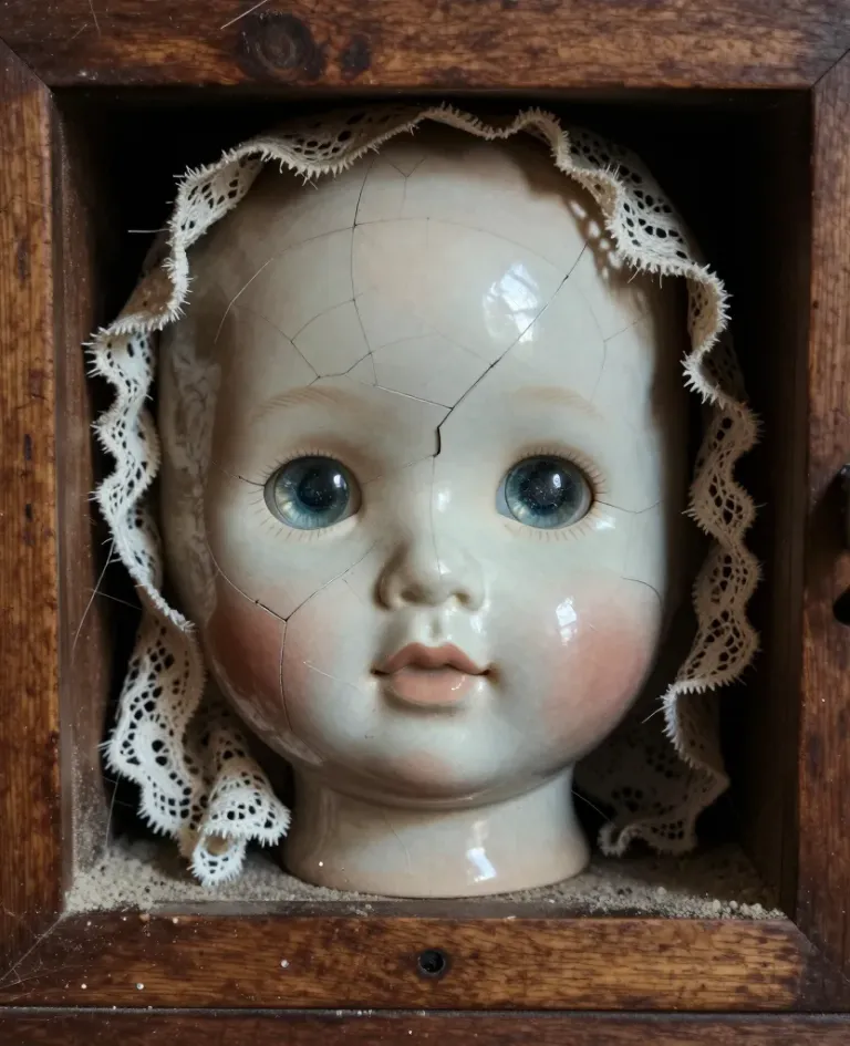 A weathered porcelain doll’s head with cracked glaze and a delicate lace bonnet rests within a rustic wooden drawer, its soft peach blush and glossy surface catching the light. The shallow depth of field and directional front-left lighting emphasize the doll’s expressive eyes and textured materials, while the darkened drawer corners create a sense of depth and intimacy.