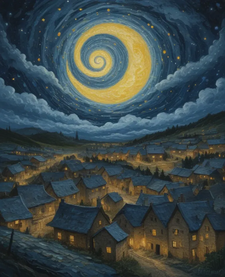 A quaint village bathed in warm lantern light against a swirling, starlit sky, creating a dreamlike and magical atmosphere. The composition and lighting emphasize the depth and vastness of the scene, making it ideal for backgrounds or as a focal point in design projects.