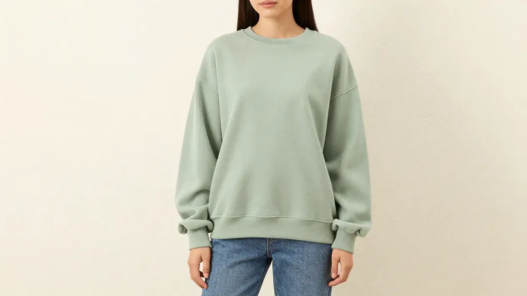 A person is centered in the frame, wearing an oversized sage green sweatshirt and blue jeans, with soft, even lighting creating gentle shadows and highlights. The neutral beige background provides a clean and unobtrusive backdrop, emphasizing the subject and their attire.