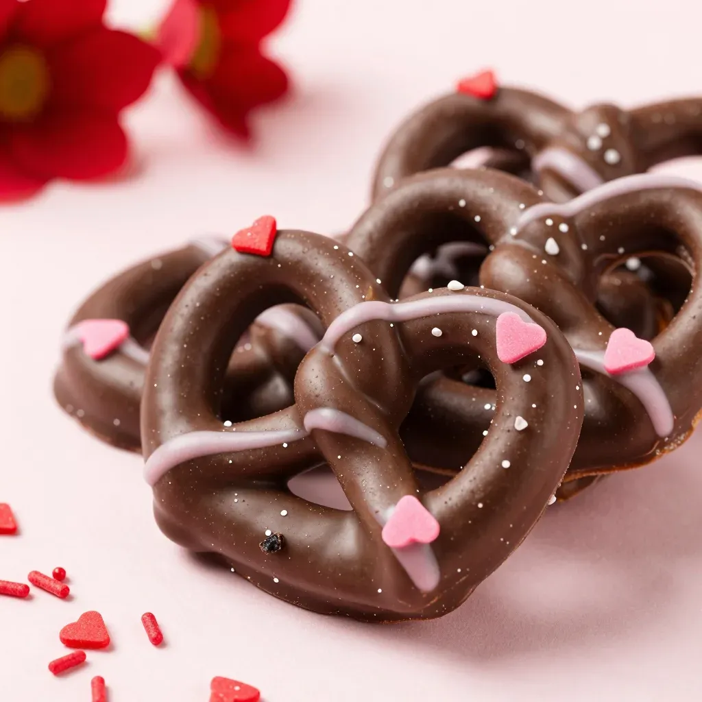Glossy dark chocolate-coated pretzels are stacked and overlapped, adorned with a pale pink icing drizzle and small pastel pink heart-shaped sprinkles, accented by fine white sugar crystals. Soft, diffused front-top lighting enhances the smooth chocolate surface and creates gentle highlights, while a shallow depth of field isolates the foreground pretzel against a clean, softly blurred pink background with out-of-focus red flowers.