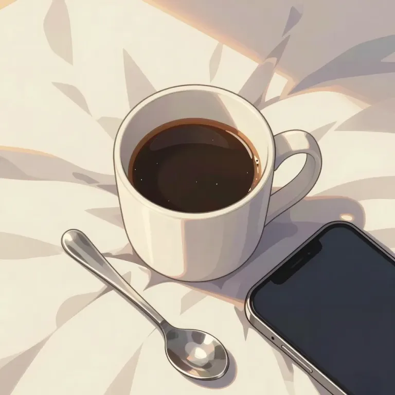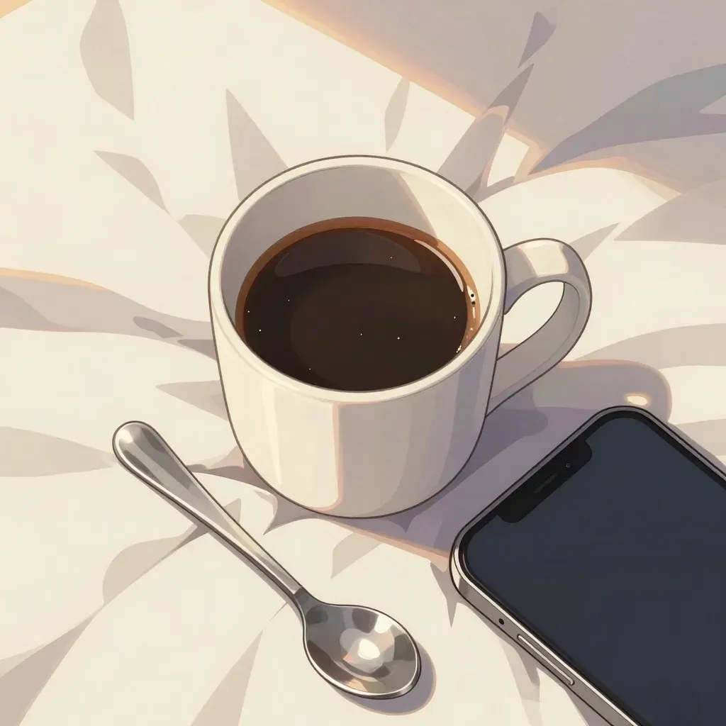 A close-up of a ceramic coffee cup, a smartphone, and a silver spoon resting on a white saucer, bathed in soft, warm light that creates gentle shadows and highlights, suggesting a serene morning scene. The shallow depth of field and abstract background provide a clean, focused composition ideal for branding or lifestyle imagery.