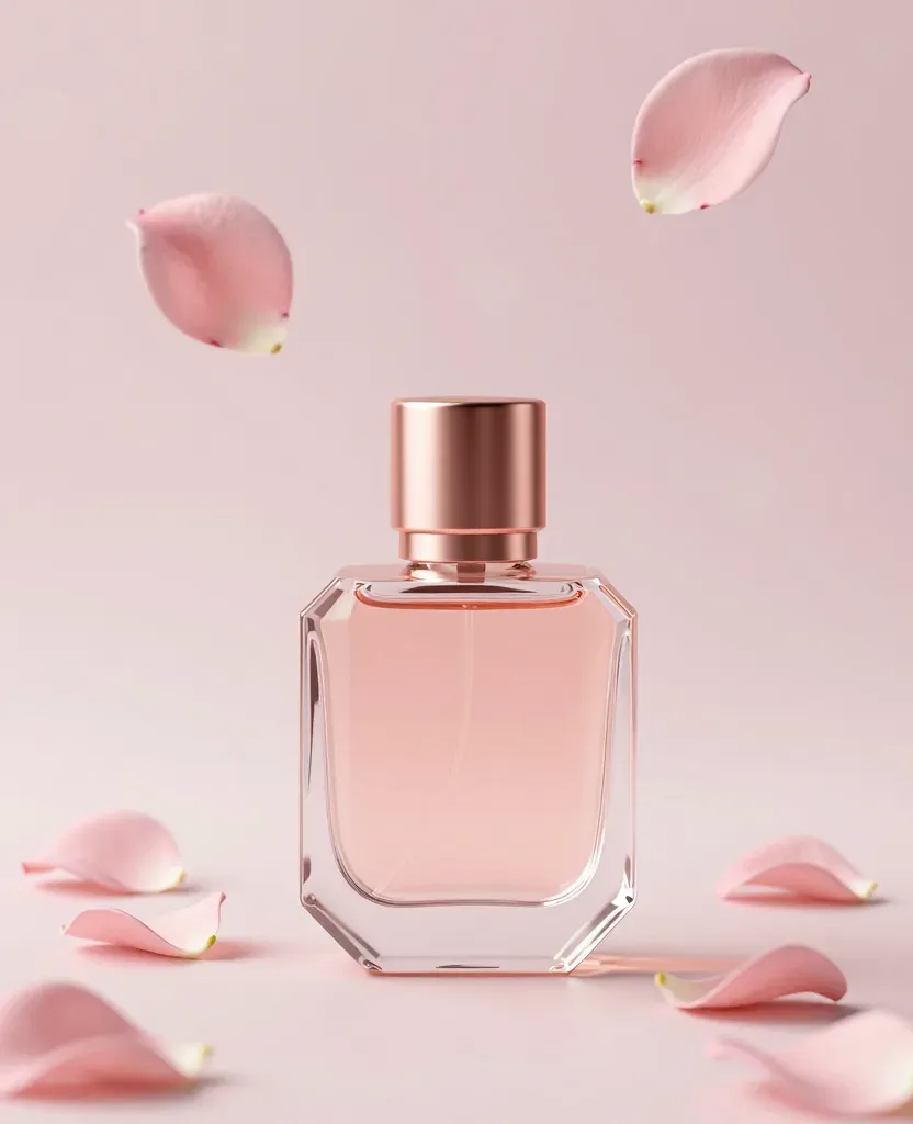 A crystal-clear perfume bottle with a rose-gold cap, set against a soft, diffused light that highlights its smooth, glossy texture and creates gentle reflections. The composition centers the bottle, with rose petals scattered around, adding depth and balance to the image.