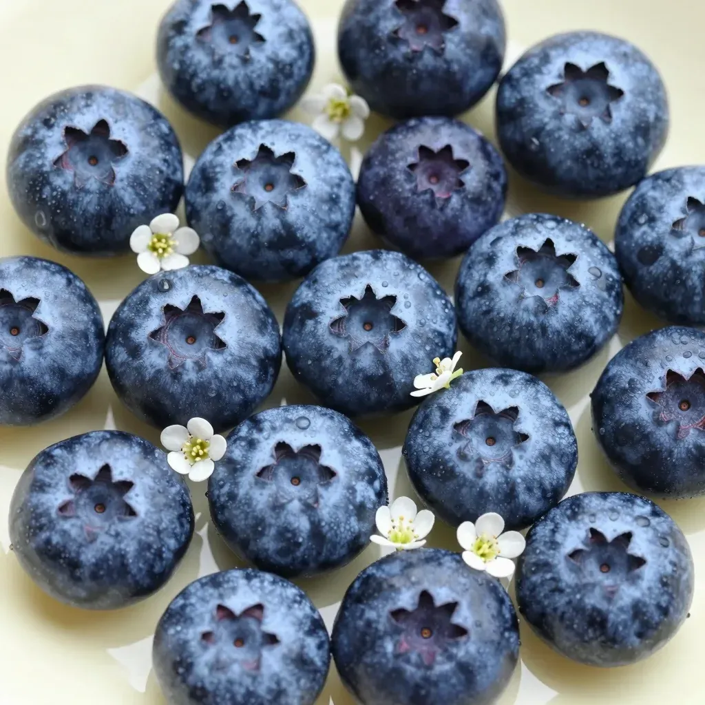 A cluster of glossy blueberries with a powdery bloom, interspersed with delicate white blossoms, arranged in a natural, organic pattern. Soft, diffused overhead lighting creates gentle highlights and subtle shadows, with a shallow depth of field emphasizing foreground berries against a smooth, out-of-focus cream background.