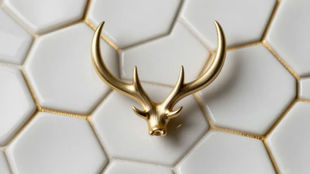 A polished gold antler brooch is centered against a backdrop of white hexagonal tiles with gold accents, softly lit to highlight its reflective surface and intricate details. The shallow depth of field draws attention to the brooch, making it ideal for product photography and interior design inspiration.