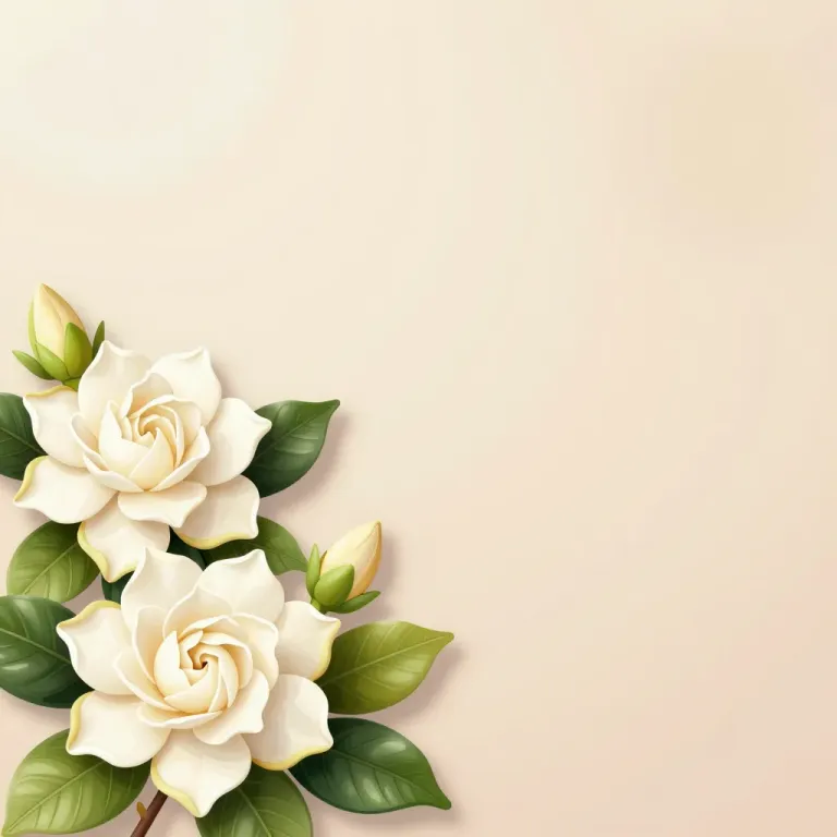 A creamy gardenia flower with layered petals and dark green leaves is corner-framed, with soft, diffused light creating gentle shadows and highlights on the petals, set against a neutral, light beige background that blurs and out of focus to emphasize the flower.