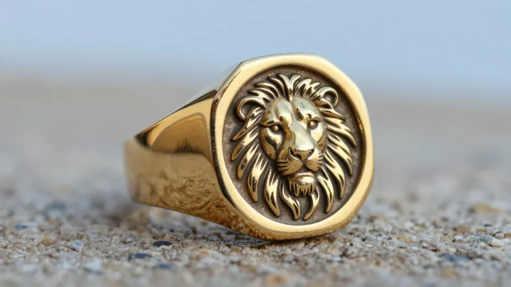 A close-up of a golden lion signet resting on gritty sand, illuminated by soft, diffused sunlight, creating highlights and shadows. The shallow depth of field isolates the signet, emphasizing its intricate details against the blurred sandy background.