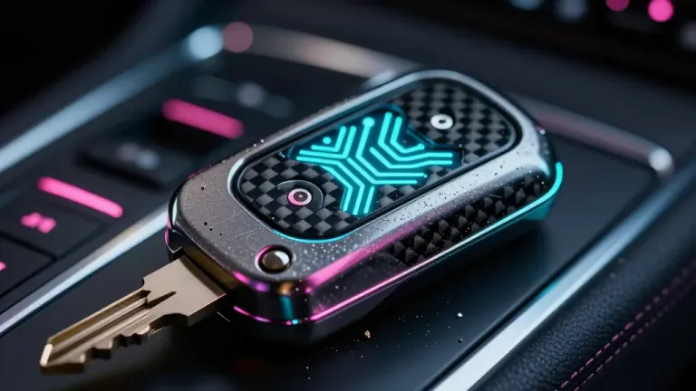 A metallic key with a glowing neon blue tip is inserted into a glossy, carbon-fiber-like keyhole, creating a reflective sheen under directional lighting. The blurred, dark background with pink accents suggests a high-tech or gaming environment, offering ample copy space for design elements.