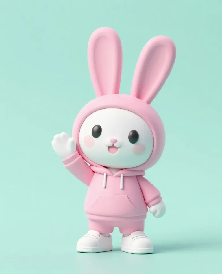 An anthropomorphic bunny mascot in a pastel pink hooded outfit waves cheerfully with one hand, its smooth matte surface accented by subtle gloss on the face and paws. Soft front-left studio lighting creates gentle highlights and minimal shadows, with a shallow depth of field isolating the subject against a uniform mint green backdrop.