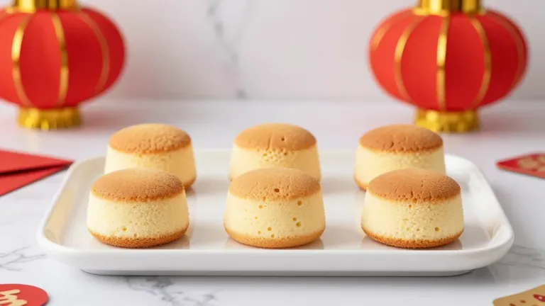 Golden sponge cakes with soft, airy texture and slightly cracked tops are arranged on a white tray, softly lit to highlight their golden hues and subtle gloss. Festive red lanterns with gold accents in the background create a celebratory atmosphere, slightly blurred to emphasize the cakes in the foreground.