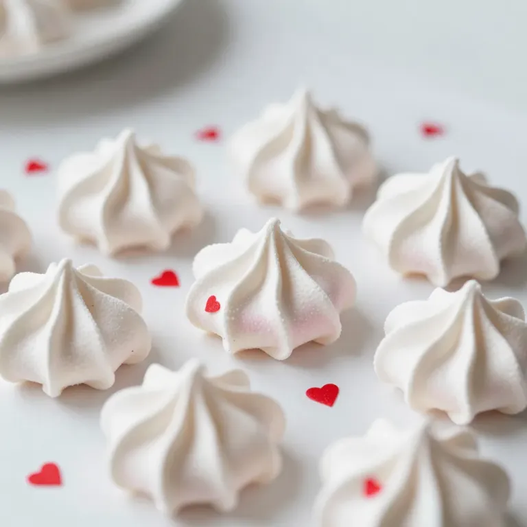Delicate meringue kisses are piped into a swirl, showcasing their light, airy texture and glossy finish under soft, diffused lighting. The clean white background and shallow depth of field emphasize the meringues, making them perfect for culinary or food-themed projects.
