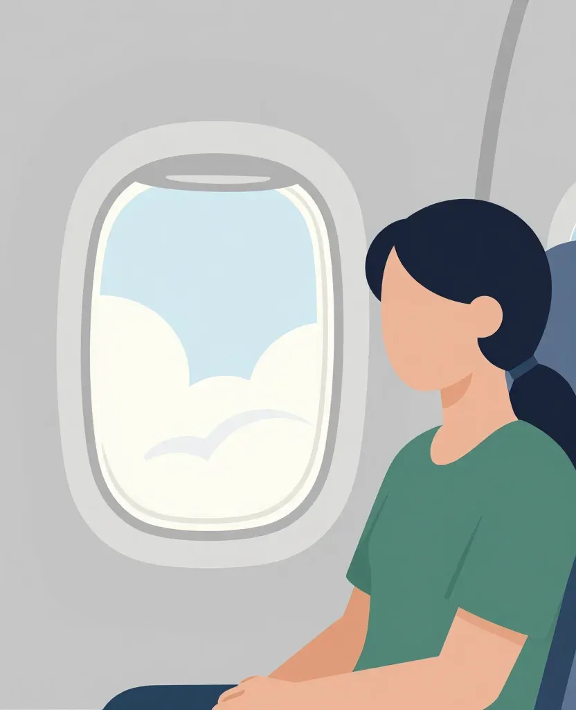 A passenger in a green shirt is seated and looking out the airplane window, with natural light creating a soft glow. The composition frames the passenger by the window, with a blurred background of clouds emphasizing the subject.
