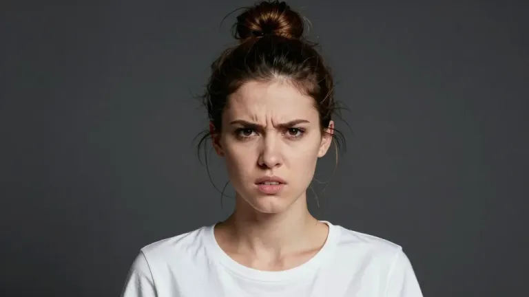 A woman with intense, angry expression in a white T-shirt, set against a dark, blurred background. High contrast lighting highlights the contours of her face and creates deep shadows, emphasizing her expression and the texture of her glossy hair and soft fabric shirt.