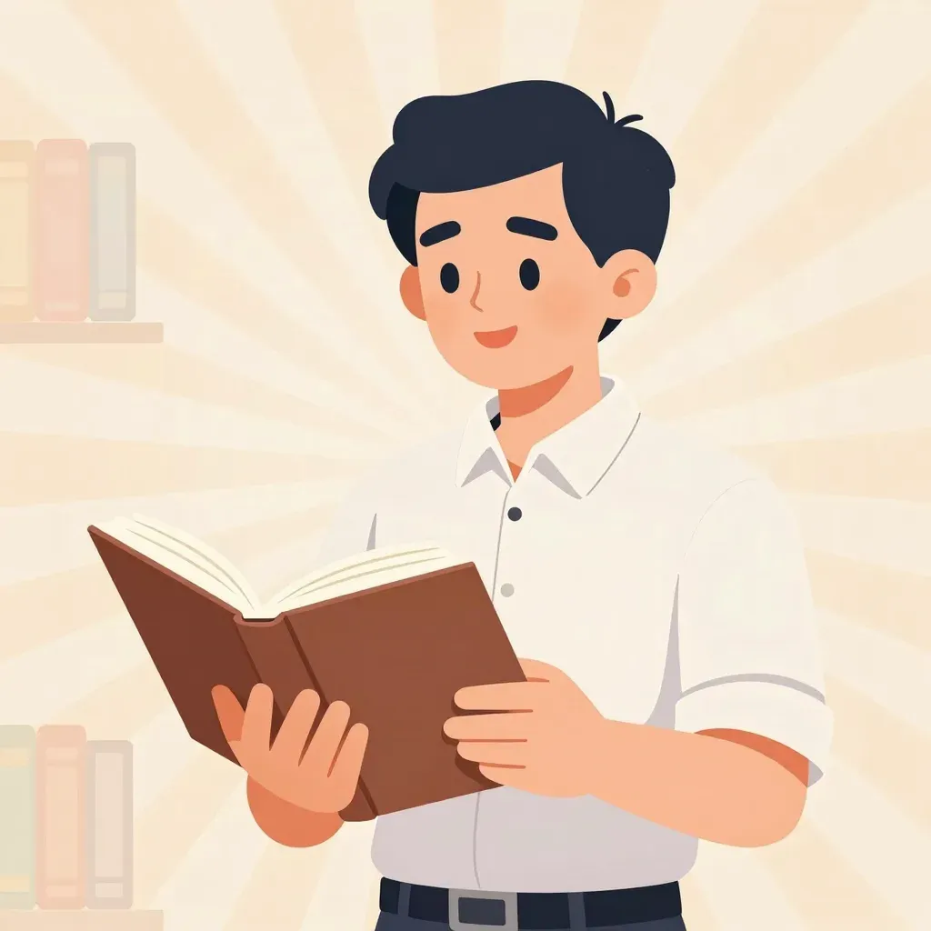 A young man with dark hair, dressed in a crisp white shirt and dark trousers, holds an open book with a smooth brown cover, his face illuminated by a warm radial glow. The symmetrical medium close-up composition features a shallow depth of field that blurs the background bookshelves, drawing focus to the subject and the soft, diffused lighting.