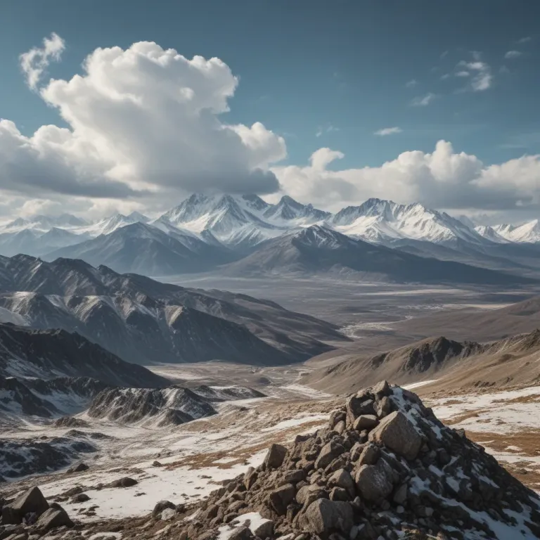A serene mountain landscape with rugged rocks in the foreground and snow-covered peaks in the background, illuminated by soft, diffused light from the late afternoon sun. The expansive desert and distant mountains provide a sense of scale and depth.