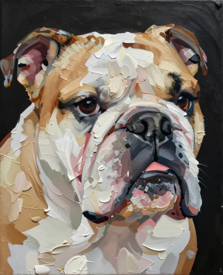 A detailed, expressive bulldog face painted with thick, layered brushstrokes, illuminated by diffused, warm light. The dark background enhances the subject's prominence and creates a striking contrast.