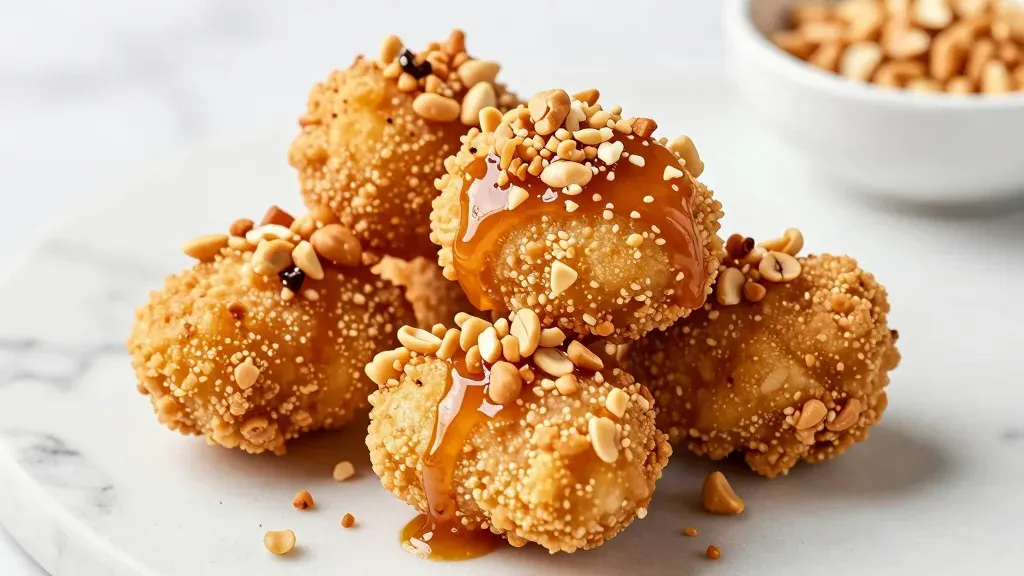 A mound of golden-brown fried croquettes is generously drizzled with glossy caramel sauce and sprinkled with coarse crushed peanuts, highlighting their textured surfaces. Soft directional lighting from the upper left enhances the sheen on the sauce and creates subtle shadows, while a shallow depth of field isolates the subject against a clean marble background with copy space.