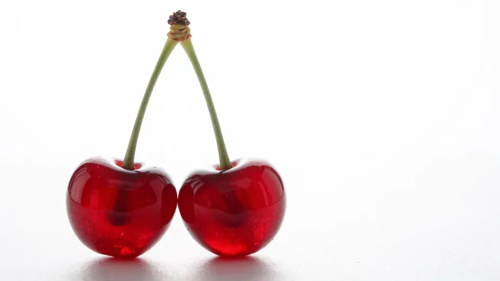 Close-up of glossy, red cherries with green stems, softly lit from above, creating gentle highlights and subtle shadows. The pure white background and shallow depth of field emphasize the cherries, offering ample copy space for design elements.