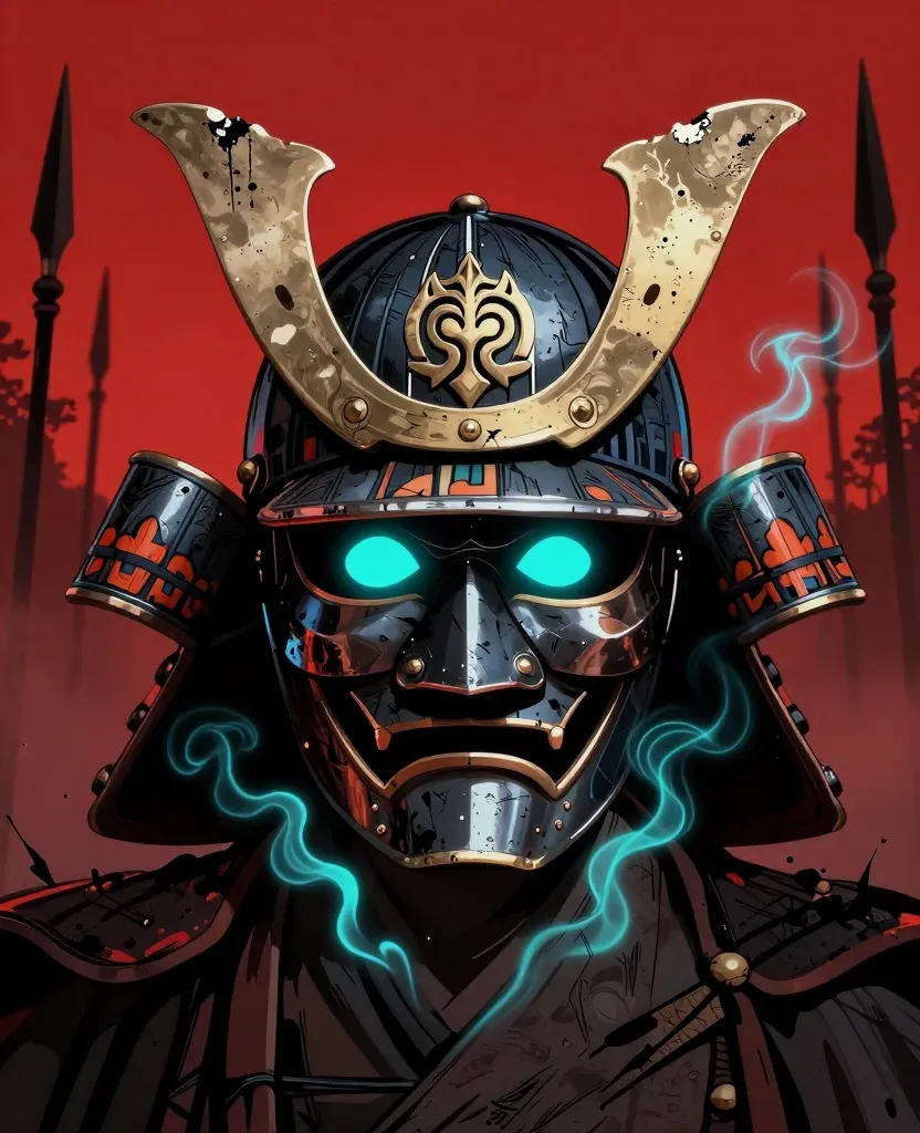A glossy black samurai helmet adorned with glowing blue eyes and electric arcs, set against a blurred battlefield background. The directional lighting highlights the helmet's intricate details and vibrant colors, creating a dramatic and dynamic composition.